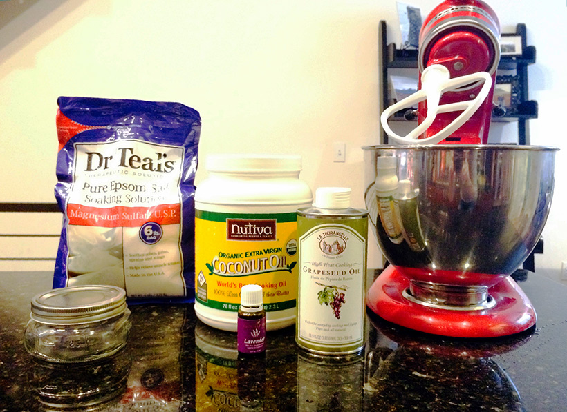 This recipe for a lavender salt scrub is AMAZING! It's easy to make, moisturizing and great for your skin. Simply whip 1 2/3 cups coconut oil in a mixer and add 1/3 cup grapeseed oil and a cup of epsom salt. Once it's a nice consistency add 20 drops of lavender essential oil (or your favorite EO) and add to containers. I used 8oz mason jars and this recipe made 3 salt scrubs. Enjoy!